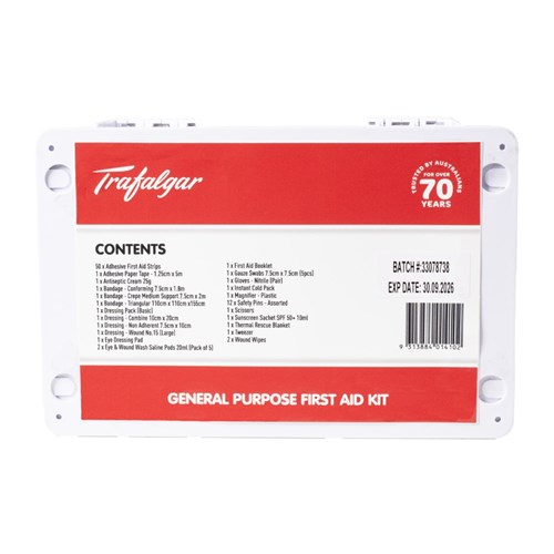Contents: 50 x Adhesive First Aid Strips, 1 x Adhesive Paper Tape 1.25cm x 5m, 1 x Antiseptic Cream 25g, 1 x Bandage Conforming 7.5cm x 1.8m and 1 x Bandage Crepe Medium Support 7.5cm x 2m.