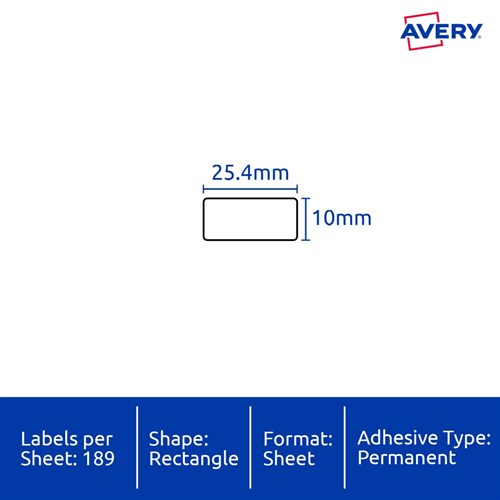 Size: 25.4mmx10mm 3780 labels, 20 sheets. 189 labels per sheet (189UP).