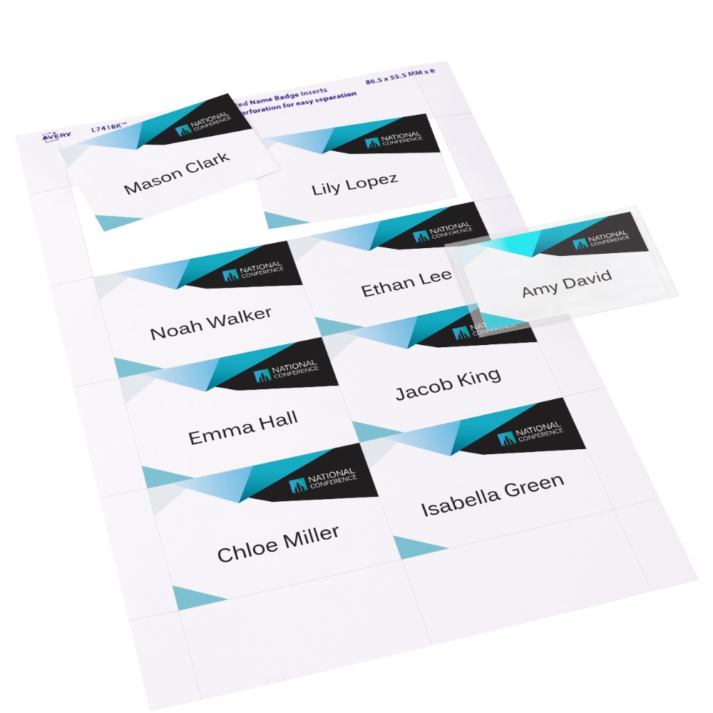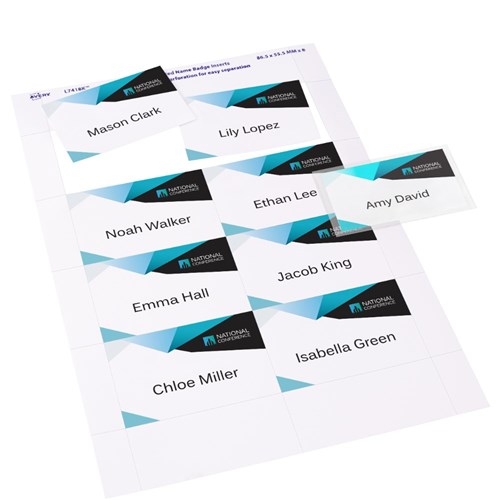 Kit contains 10 reusable magnetic badge holders, 2 sheets of 150gsm printable insert cards, each with 8 perforated name badges.