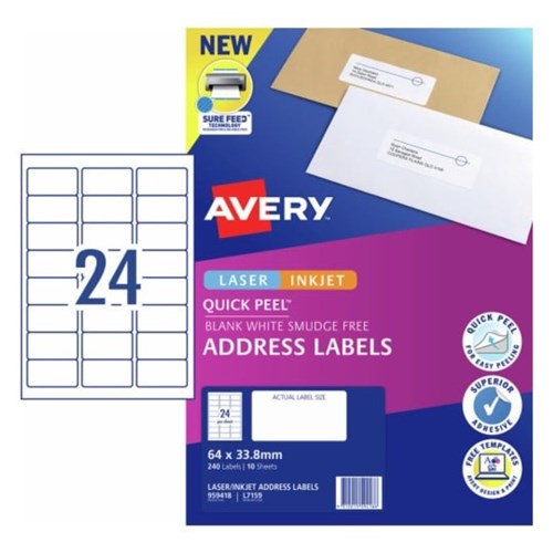 Avery Quick Peel Address Laser & Inkjet Labels White L7159 64x33.8mm 240 Labels