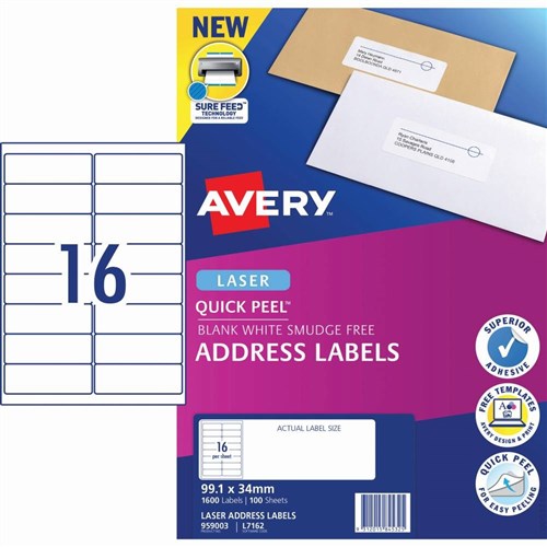 Avery Quick Peel Address Laser White L7162 99.1x34.2mm 16UP 1600 Labels 100 Sheets