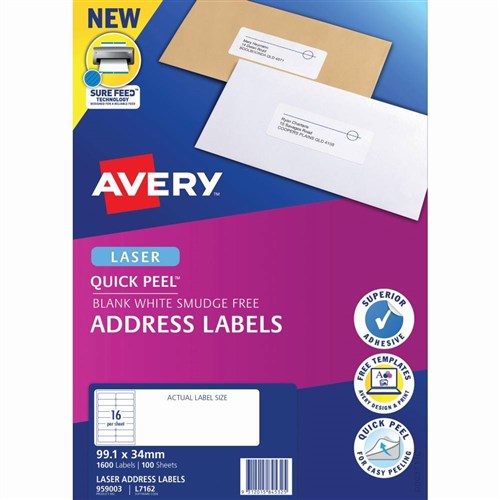 Avery Quick Peel Address Laser Labels White L7162 99.1x34mm 16UP 320 Labels 20 Sheets
