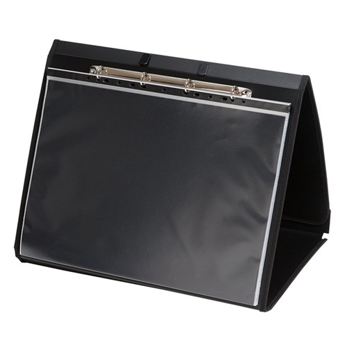 Premium quality copy safe 20 page A3 refillable landscape easel display book with spine handle, card window and black insert paper in each page.