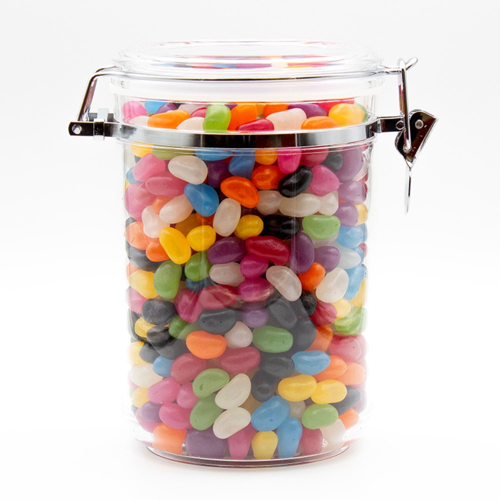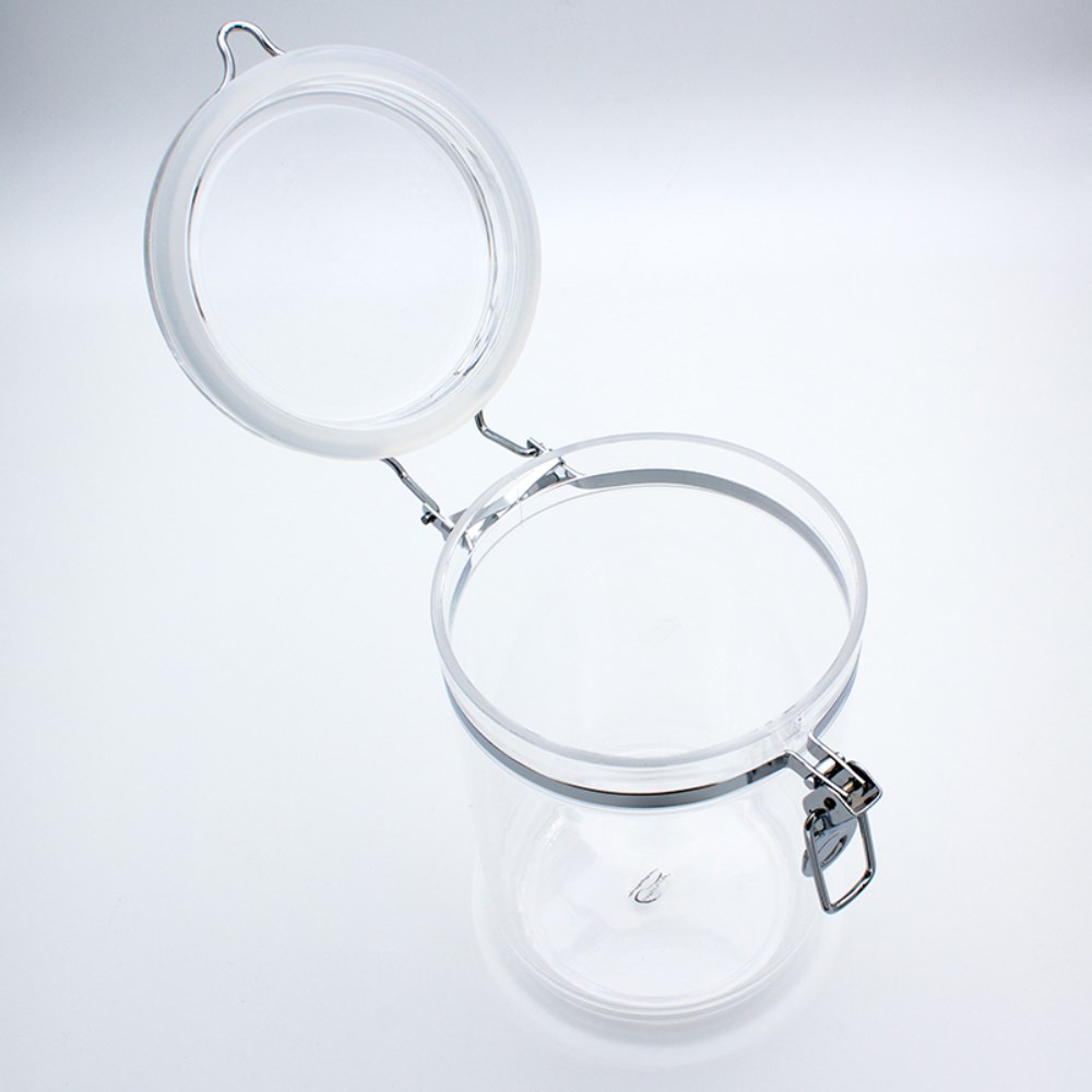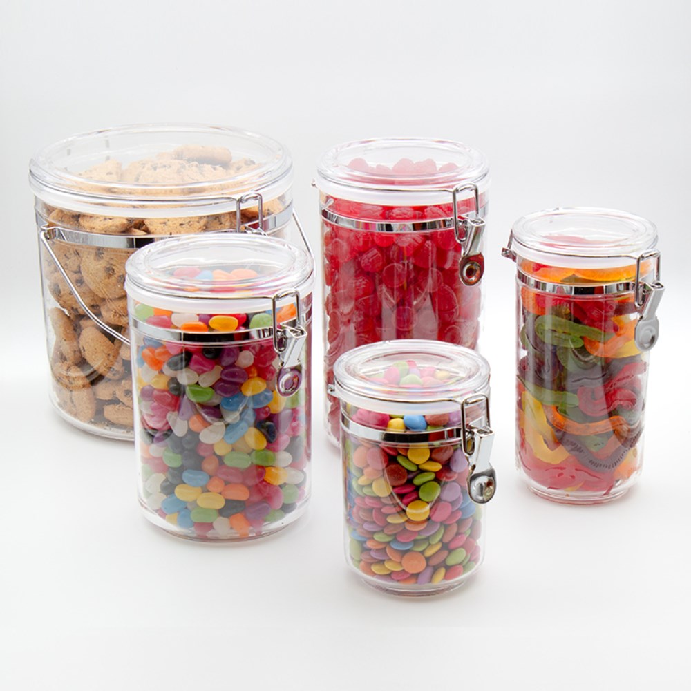 Durable and versatile airtight canisters made from strong, clear acrylic material with chrome clip for sealing.