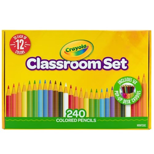 240 coloured pencils that come in a box that folds out into desk caddies, so you divide these fun coloured pencils throughout the whole class.