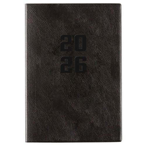 Casebound diary with current year embossed in PVC cover and all-round border stitching.