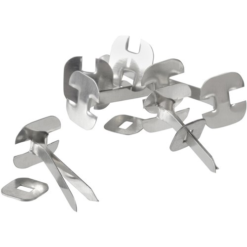 Each has pointed ends and is fitted with a washer to securely hold papers or documents together.