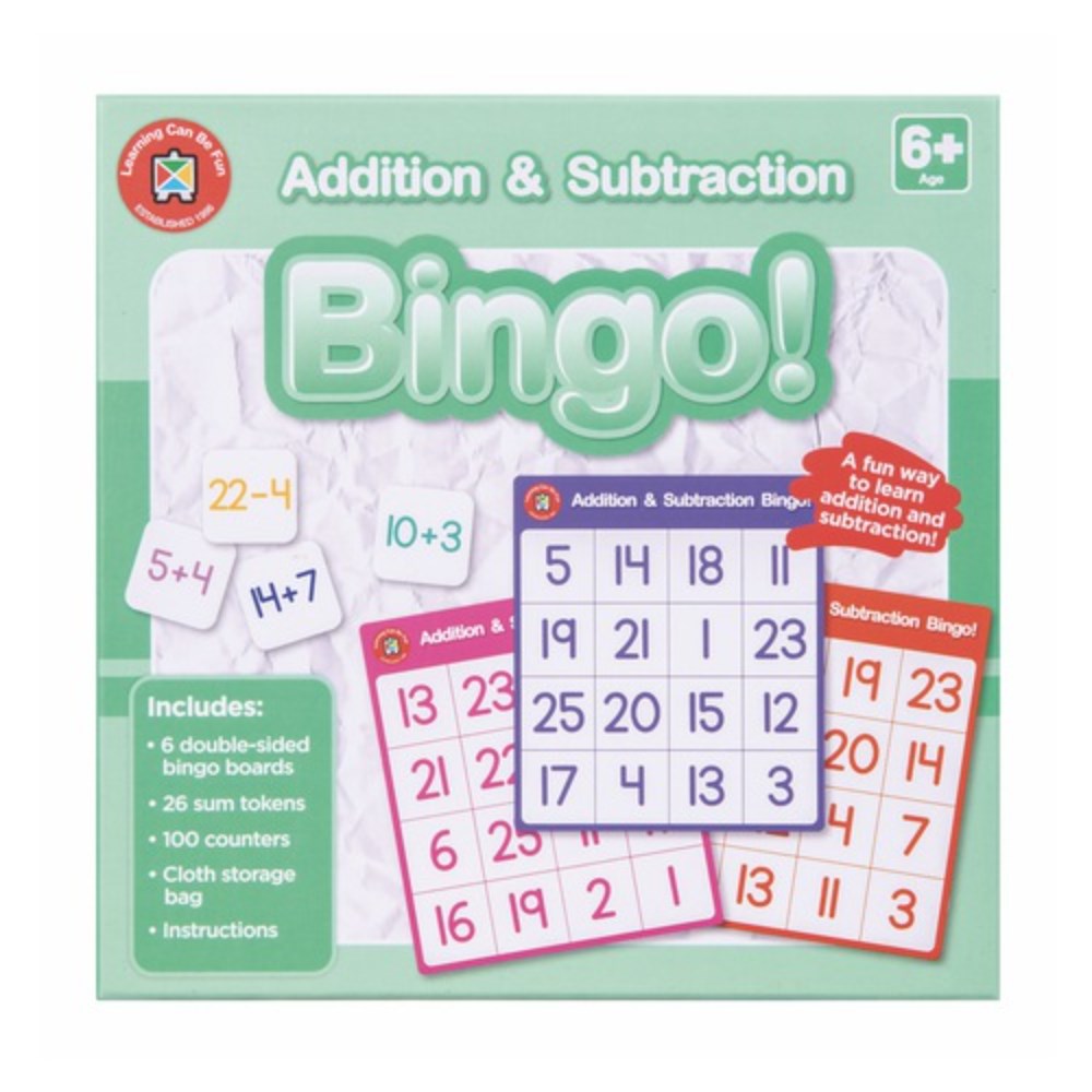 Includes: 6 double-sided bingo boards, 26 sum tokens, 100 counters, cloth storage bag and instructions.