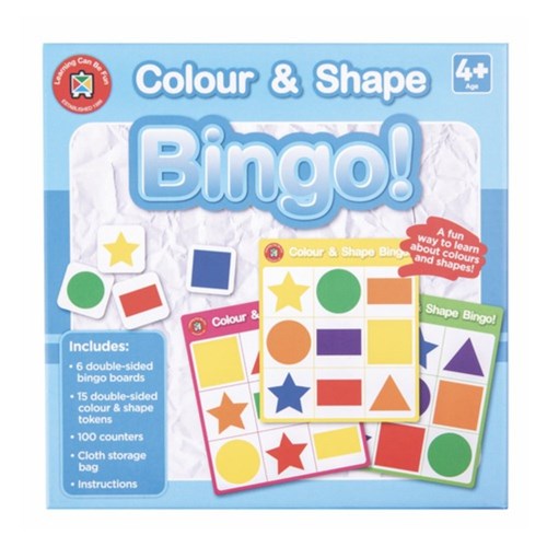 Includes: 6 double-sided bingo boards, 15 double-sided colour and shape tokens, 100 counters, cloth storage bag and instructions.
