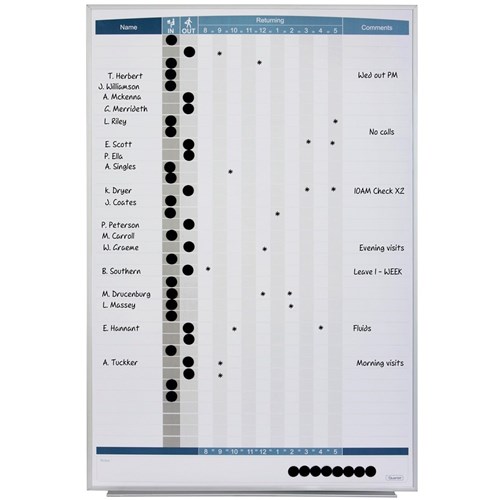 Quartet Matrix In/Out boards are an ideal space saving way to keep track of personnel.