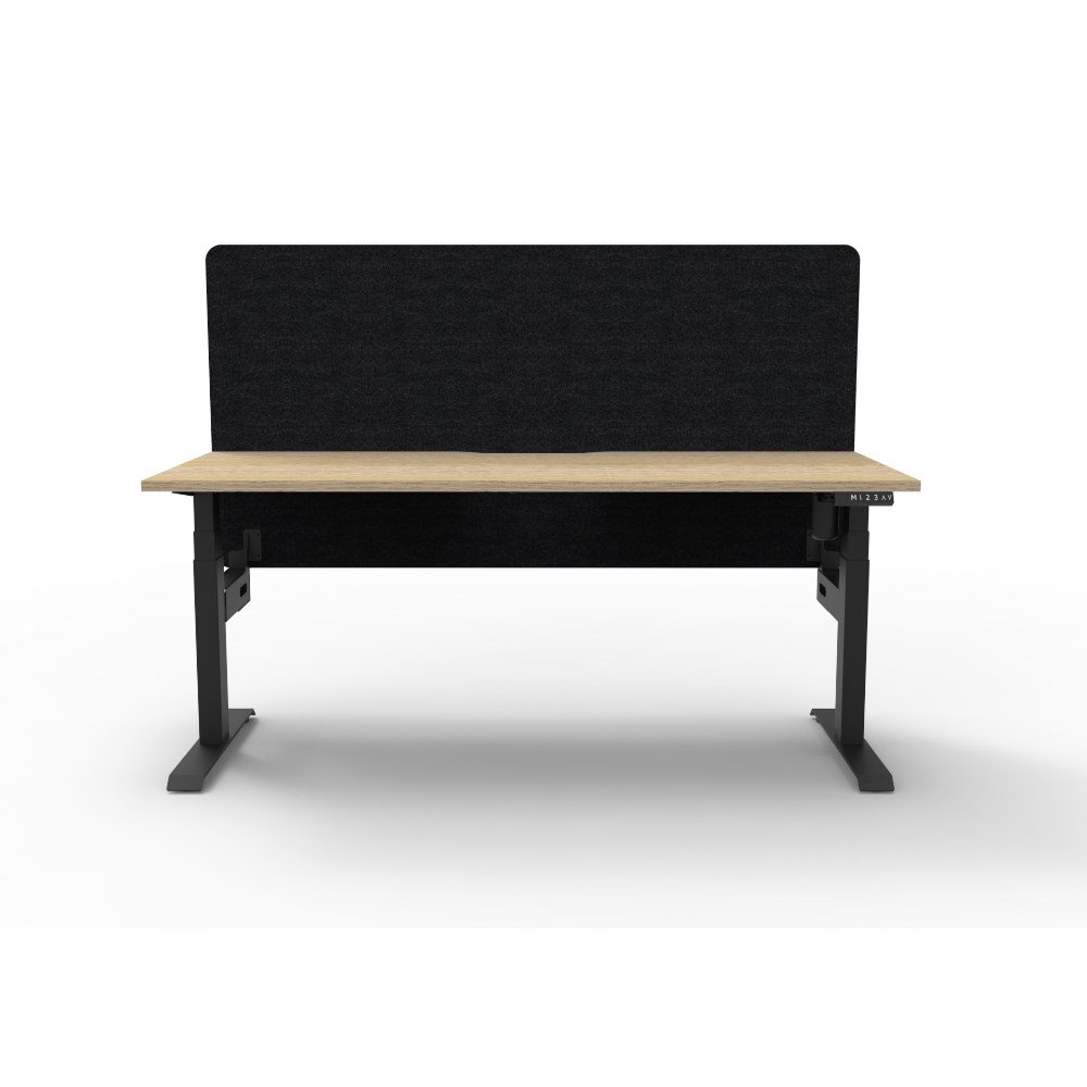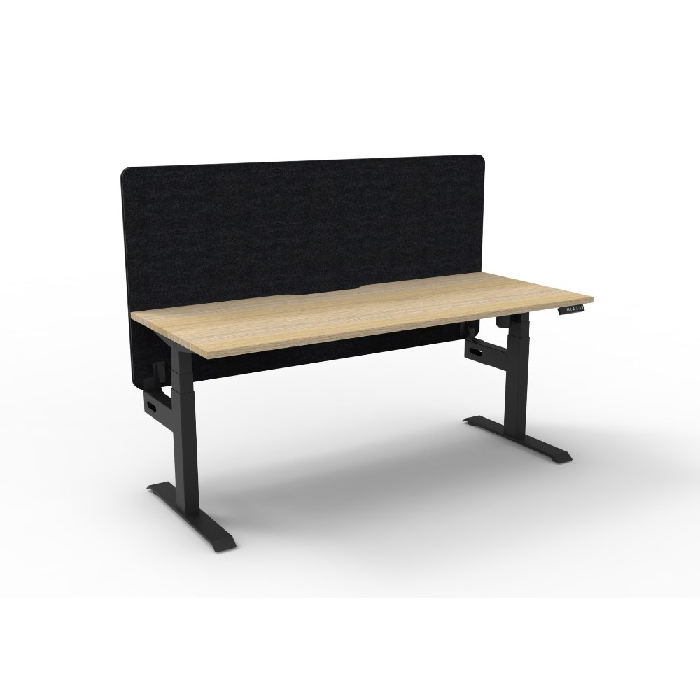 Electric height adjustable single sided workstation with Natural Oak top and Black Satin frame, Black Eco screen.
