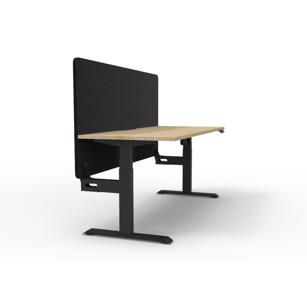 Electric height adjustable single sided workstation with Natural Oak top and Black Satin frame, Black Eco screen.