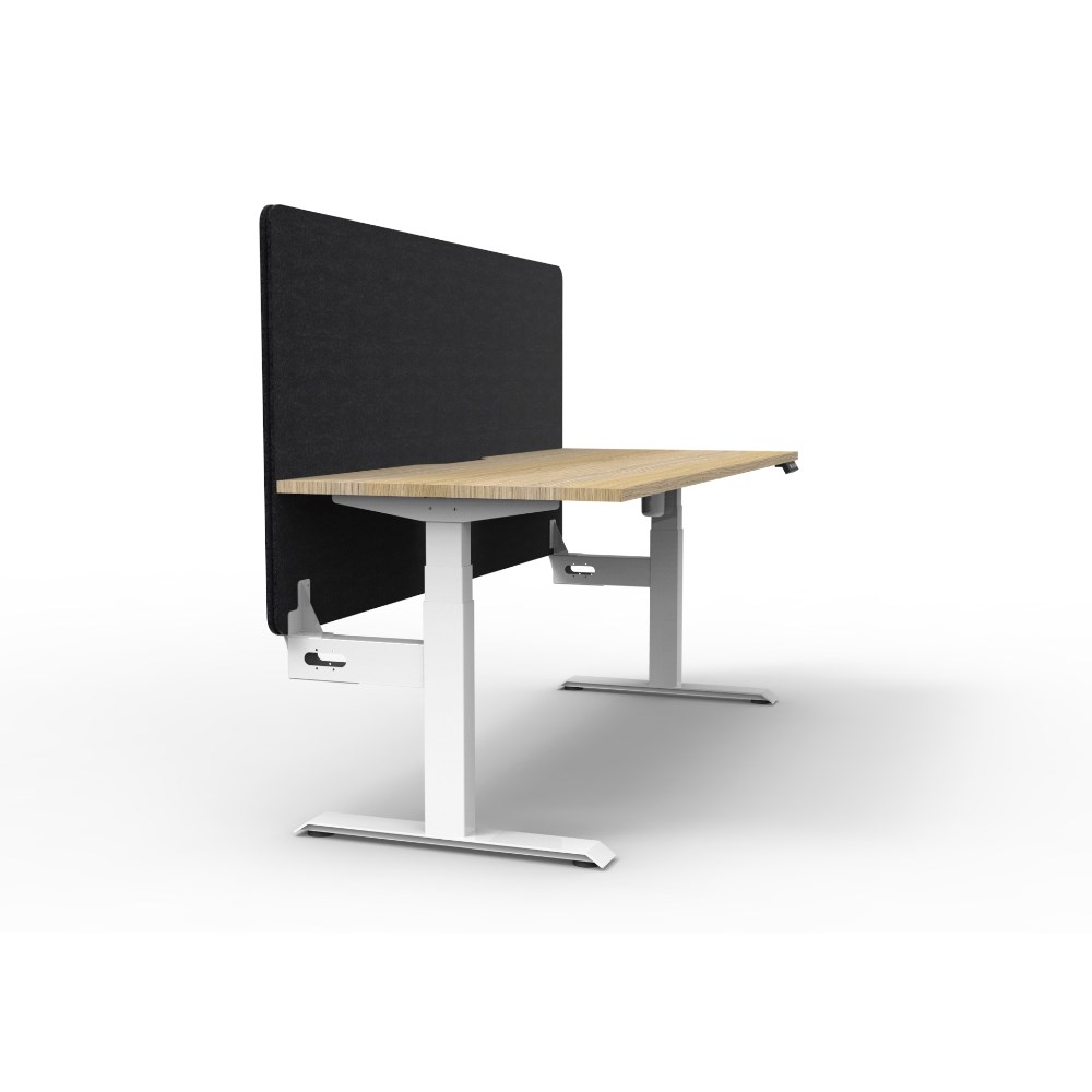 Electric height adjustable single sided workstation with Natural Oak top and White Satin frame, Black Eco screen.