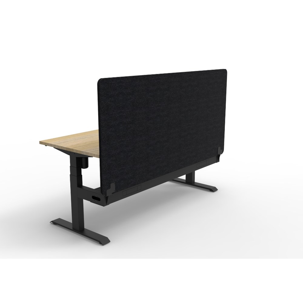 Electric height adjustable single sided workstation with Natural Oak top and Black Satin frame, Black Eco screen and cable tray.