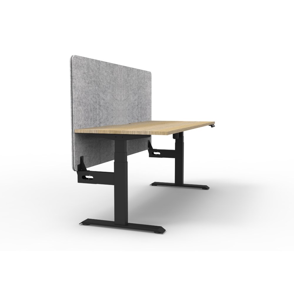 Electric height adjustable single sided workstation with Natural Oak top and Black Satin frame, Grey Eco screen.