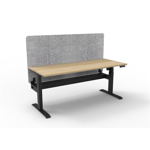 Electric height adjustable single sided workstation with Natural Oak top and Black Satin frame, Grey Eco screen and cable tray.