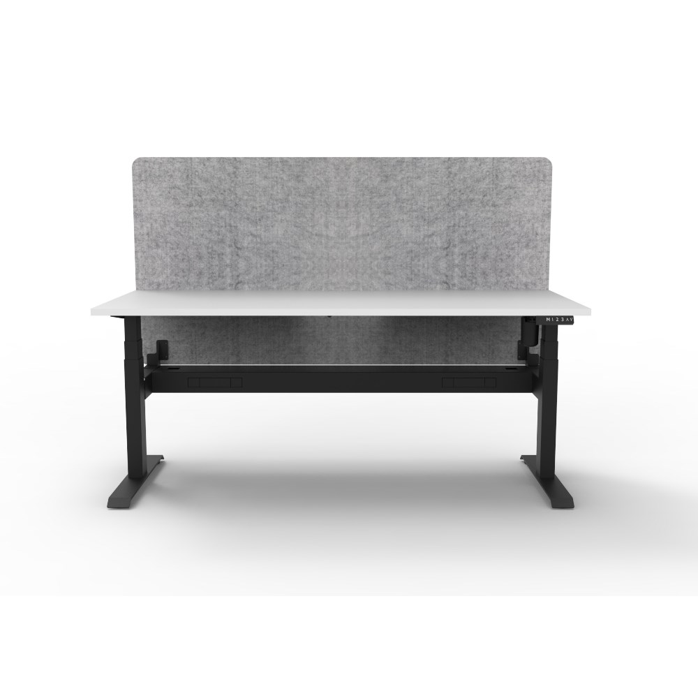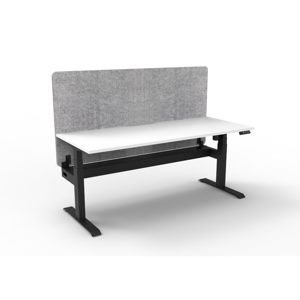 Electric height adjustable single sided workstation with Natural White top and Black Satin frame, Grey Eco screen and cable tray.