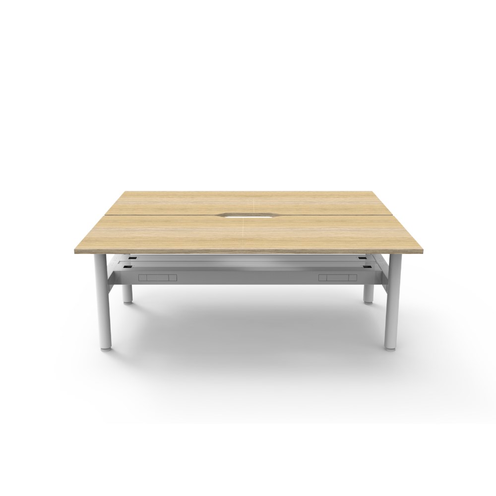 Natural Oak top White Satin frame. Double sided workstation with cable tray.
