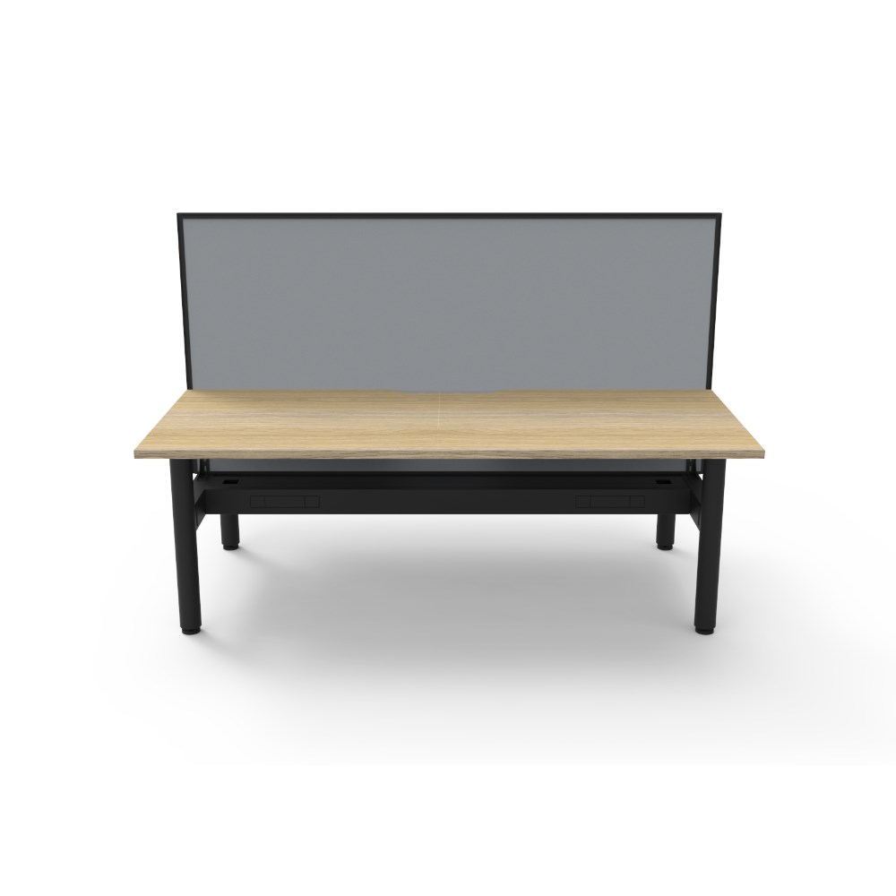Natural Oak top Black Satin frame. Double sided workstation with screen and cable tray.