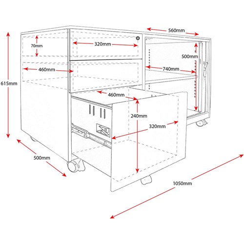 Internals: Tambour Size 560W x 740D x 500H, Top two drawers 320W x 460D x 70H, Bottom filing drawer 320W x 460D x 240H.