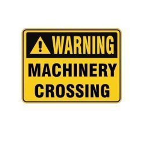 SIGN - WARNING MACHINERY CROSSING - 220X150MM ADHESIVE STICKER PK2