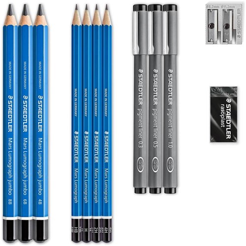 Pack includes the following: Mars Lumograph 100 & Mars Lumograph jumbo 100J to sketch the baselines of the artwork and draw gently light pencils strokes