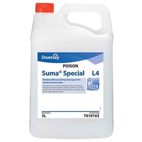 Suma Special L4 is a concentrated liquid dishmachine detergent specially formulated to provide excellent soil removal in medium hard water conditions. Especially suited for use in glass washing machines.