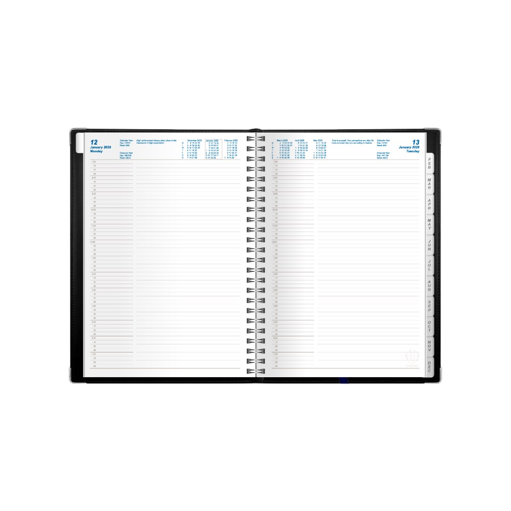 Double wire binding. Lay flat opening. Ribbon marker. Tabs. Translucent pocket.