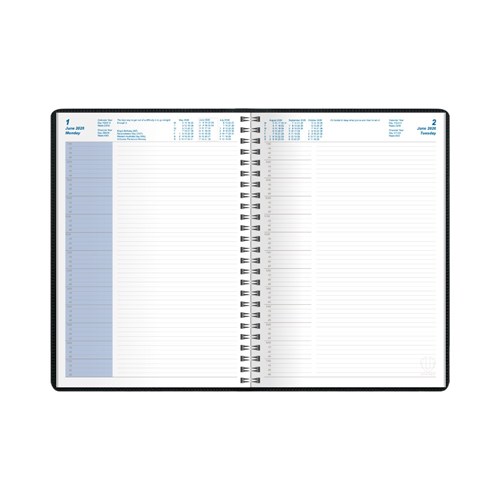 Featuring a padded, phthalate free, PVC cover, pockets for storing business cards and wire-o binding to allow the diary to lie completely flat when open.