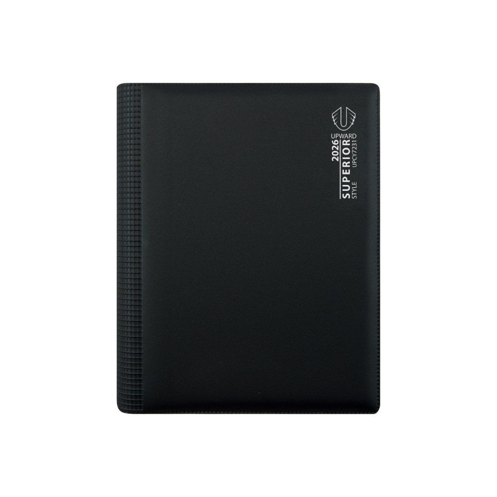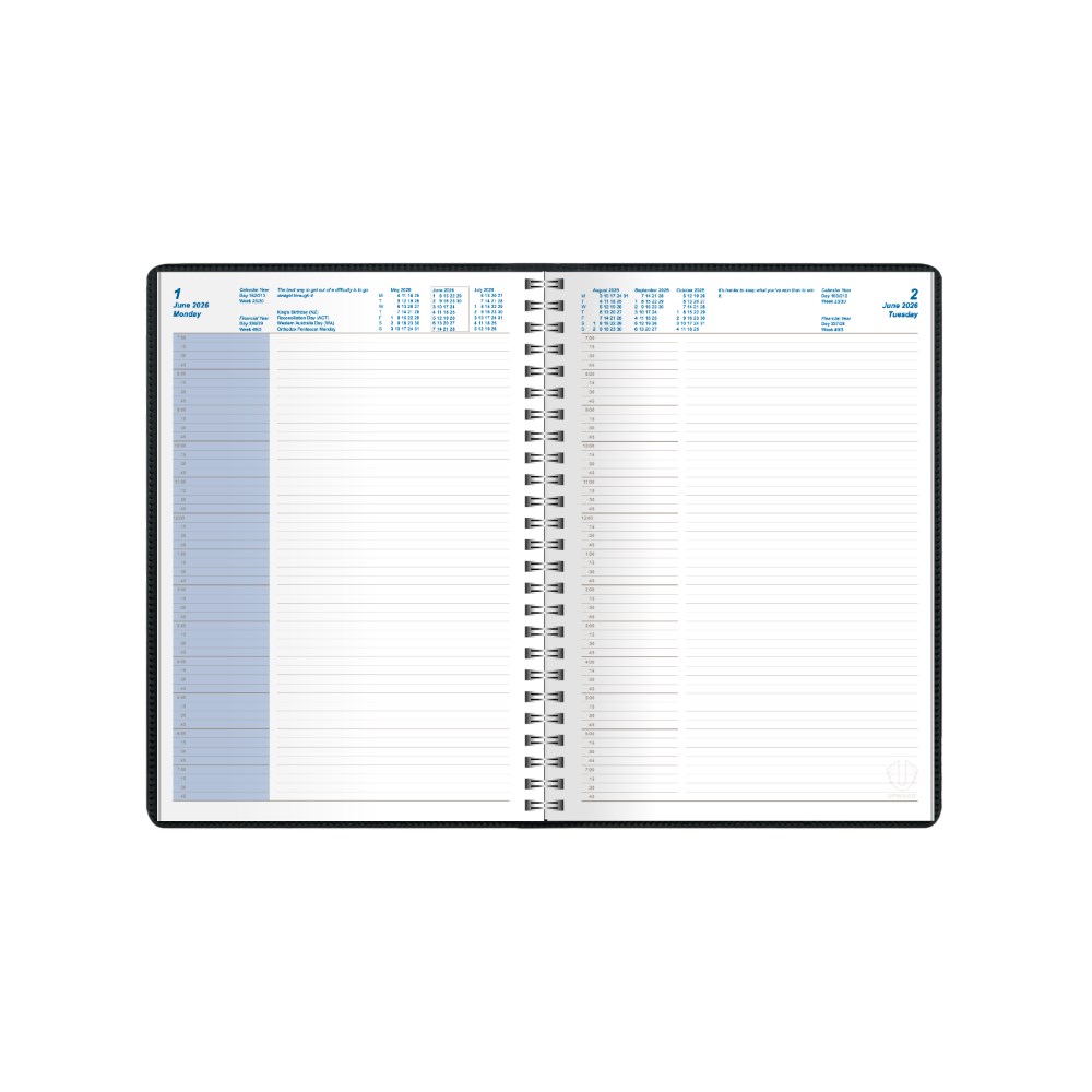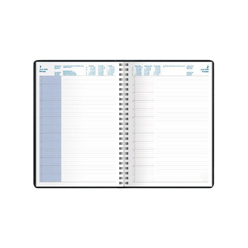 Featuring a padded, phthalate free, PVC cover, pockets for storing business cards and wire-o binding to allow the diary to lie completely flat when open.