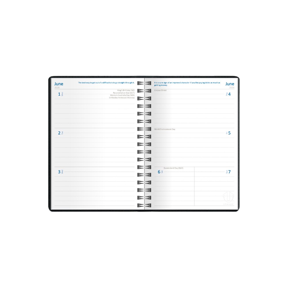 Featuring a padded, phthalate free, PVC cover, pockets for storing business cards and wire-o binding to allow the diary to lie completely flat when open.