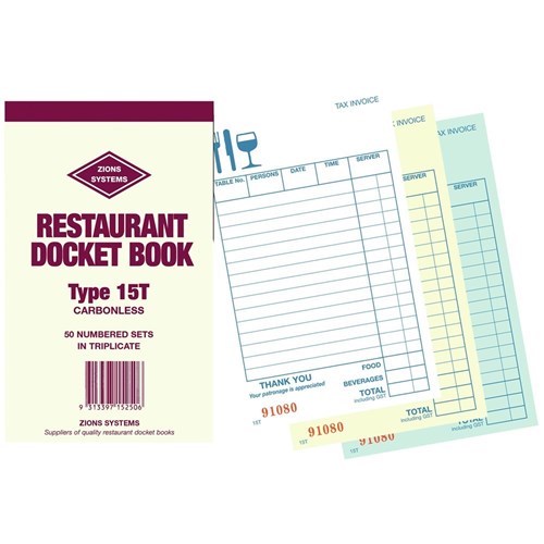 Zions offers a wide range of single, duplicate, triplicate and quadruplicate restaurant docket books, suitable for all styles of bistros, cafes, restaurants and take-away outlets.